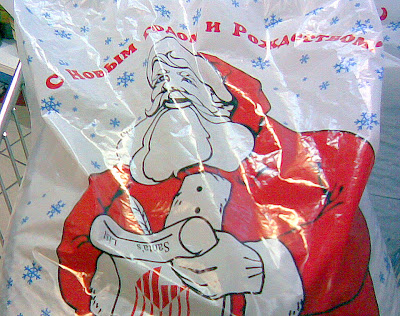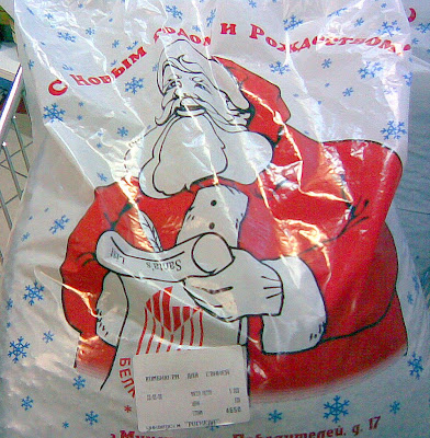 Целую тележку с такими мешками я обнаружил в одном из продуктовых универсамов. Конечно, меня изначально привлекло изображение Деда Мороза и надпись "С Новым Годом и Рождество!", которые очень уж удивительно видеть посреди лета. Но я не стал бы фотографировать эти мешки и, тем более, показывать вам, если бы не их содержимое. Как вы думаете, что можно продавать посреди лета в продуктовом магазине в мешках с Дедом Морозом?